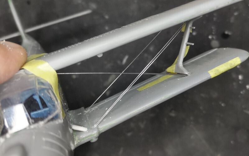 張線の下拵えができたら、改めて上翼を接着し、翼間支柱も接着しました。